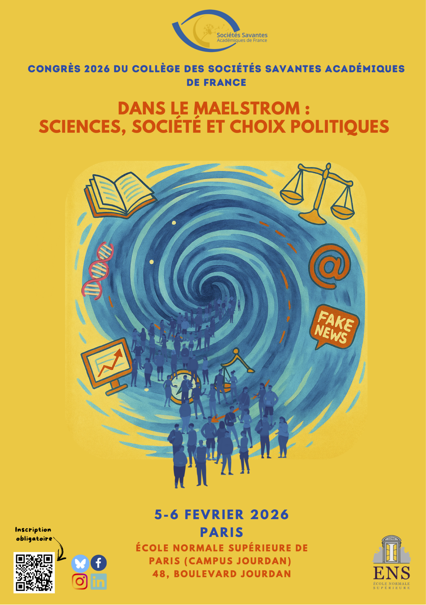 La journée scientifique, intitulée « Dans le Maelstrom: sciences, société et choix politiques», reviendra sur la place des sciences dans le débat et la décision publiques, et l’arrimage entre libertés politiques et scientifiques. Elle aura lieu le jeudi 5 février 2026 de 9h à 17h45 (accueil café à 8h30) dans l’ amphithéâtre Daniel Cohen de l’ENS PSL – Campus Jourdan, 48 boulevard Jourdan, Paris, 75014.  Cette journée est ouverte à l’ensemble de la communauté académique (téléchargez l’affiche).