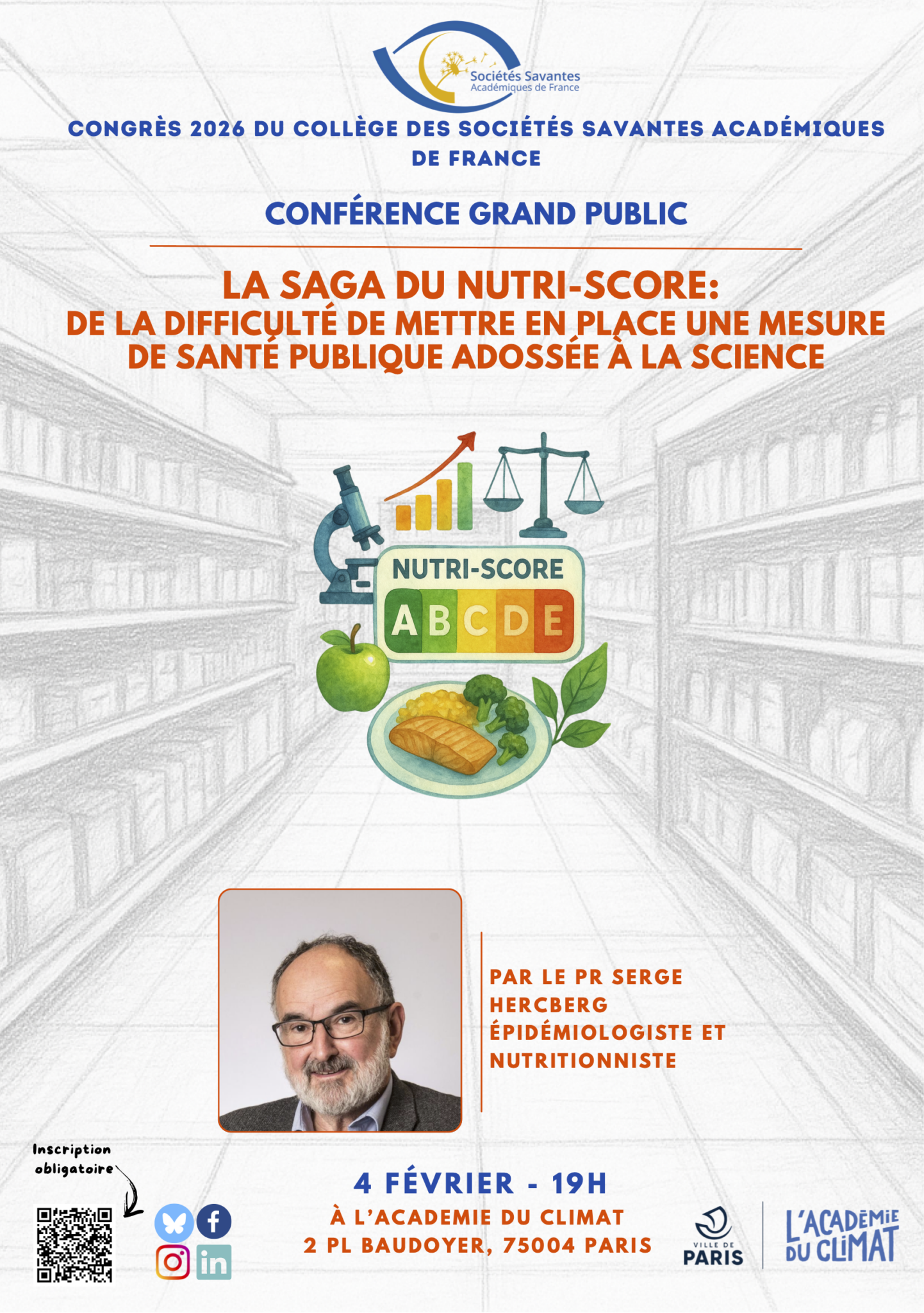 La conférence grand public sera donnée par l’épidémiologiste et nutritionniste Serge Hercbergle 4 février à 19h à l’Académie du Climat, 2 place Baudoyer, 75004 Paris. Elle aura pour thème : «La saga du Nutri-Score: de la difficulté de mettre en place une mesure de santé publique adossée à la science”. Pour en savoir plus et pour vous inscrire gratuitement en ligne cliquez ici. Vous pouvez aussi télécharger l’affiche.